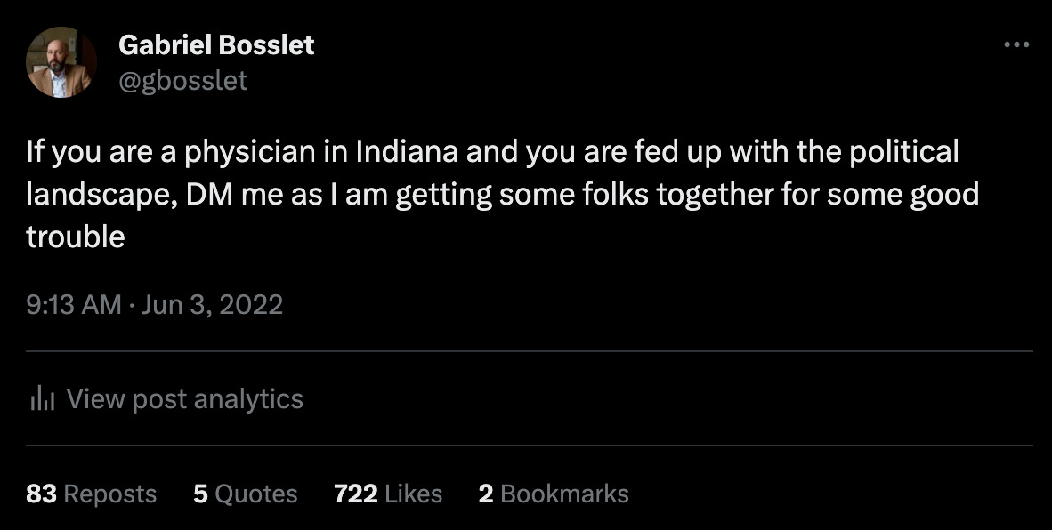 And then the leaked Dobbs opinion (Gersten and Ward, n.d.) in early May ignited rumors of a special legislative session that summer to ban abortion in Indiana (Governor Eric Holcomb, n.d.). This was met with relative silence from most of the medical community in Indiana; there was seemingly no coordinated effort to push back on this intrusion into the doctor-patient relationship.
